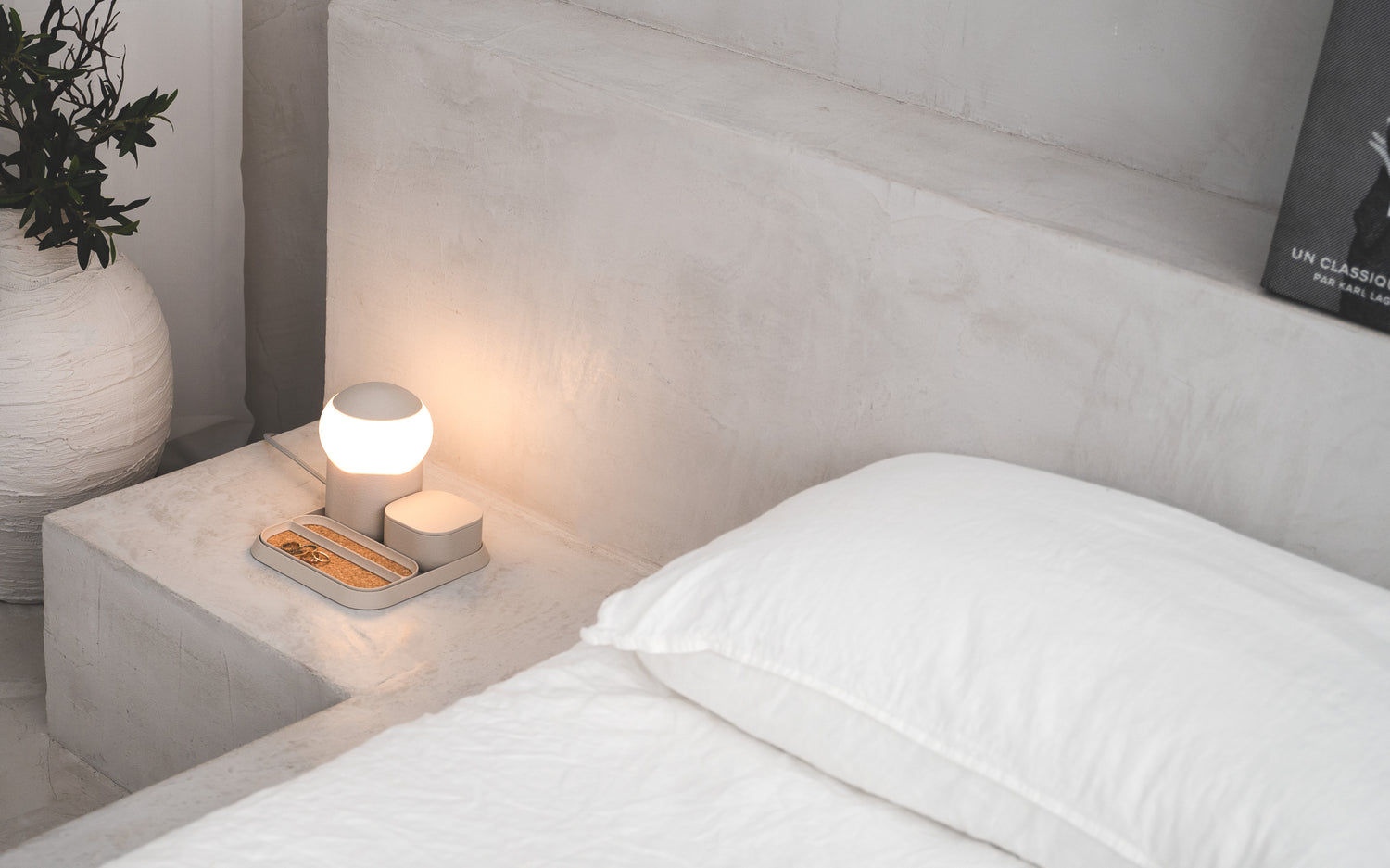 The Base Living Organizer combines aesthetic design with precise organisation and is versatile due to the small, dimmable Base Table Lamp. Its rounded, minimalist form, coupled with practical functionality, not only fosters a harmonious calm in its surroundings but also promotes order and productivity.